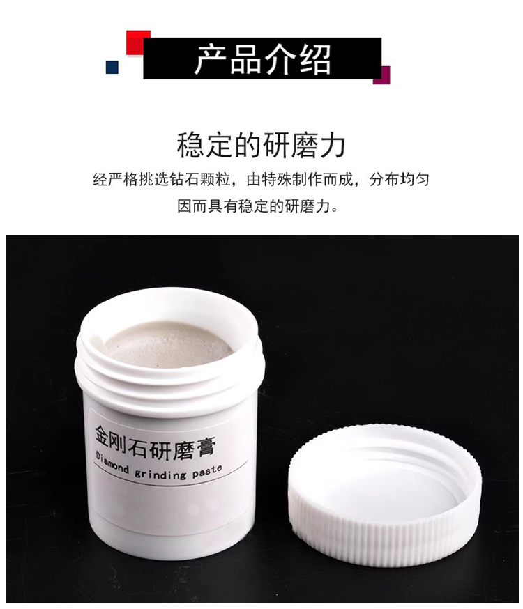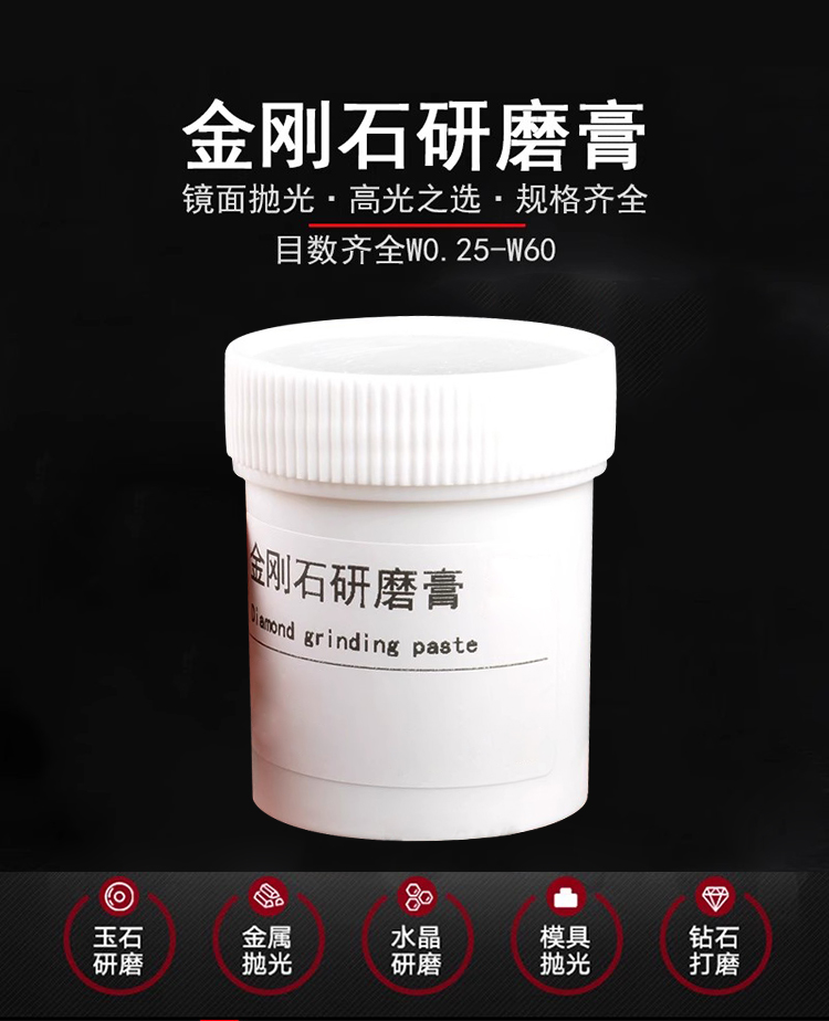 金刚石研磨膏适用于翡翠、玛瑙、水晶、玉石,琥珀等工艺品、陶瓷硬质合金等高硬度材料制品的量具、刃具光学仪器及其他高光洁度工件的研磨,抛光加工。