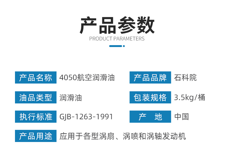 是石科院生产的、满足国军标GJB 1263-1991的国产高温合成航空润滑油。4050油的的组成是新戊基多元醇酯外加抗氧剂、抗腐蚀剂和抗泡剂等添加剂。其主要是针对涡轮风扇发动机和涡轮喷气发动机研制,目前主要应用于各型装备了涡扇、涡喷和涡轴发动机的军用飞机和民用燃气轮机组。